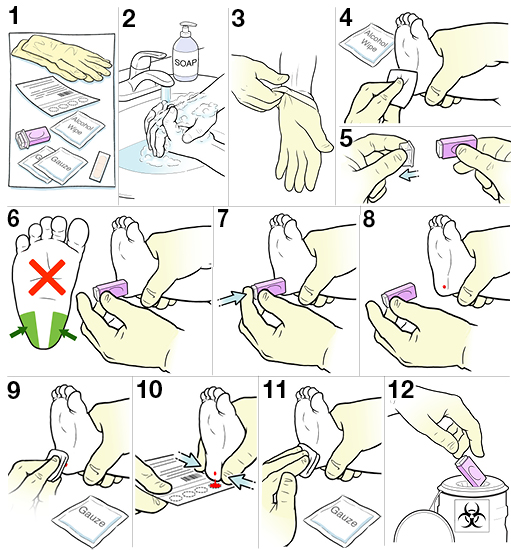 13 steps for doing a heel stick on a baby.