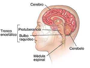 • Tronco encefálico. Se encuentra en el medio del encéfalo. Consta del mesencéfalo, la protuberancia y el bulbo raquídeo. El tronco encefálico controla el movimiento de los ojos, la cara y la boca. También transmite mensajes sensoriales (como calor, dolor y ruido) y controla la respiración, el estado de consciencia, la función cardíaca, los movimientos musculares involuntarios, los estornudos, la tos, los vómitos y el acto de tragar.