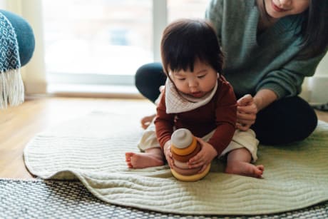 • Sit your baby with less support. Try holding them lower downaround the waist or pelvis. Try it as soon as they have good head control. This gives them more of their body to practice stacking toys and balancing.